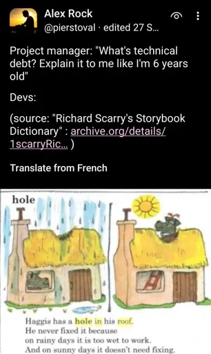Perfect ELI6 😂 Tech debt is that leaky roof: you can ignore it for a while, but every new ‘feature’ gets harder until you finally fix it.