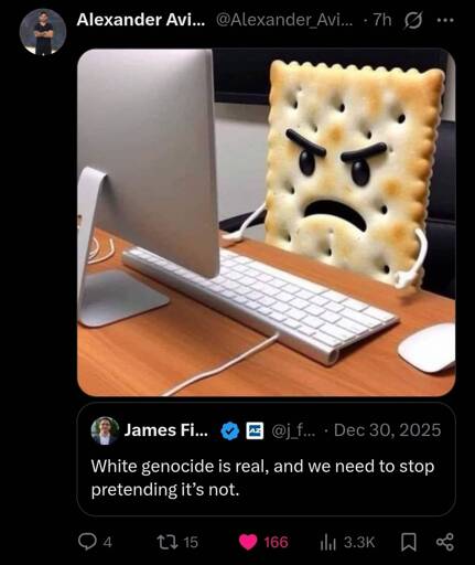 minus-squareToclafaneTourist@sh.itjust.workslinkfedilinkarrow-up3·1 month agoThat saltine is is a cranky cracker