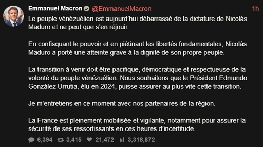 arrow-up118arrow-down1imageEmmanuel Macron à propos du bombardement de Caracas par les US, et le kidnapping de Nicolas Madurojlai.luinlandempire@jlai.lu to Monde@jlai.luFrançais · 1 month agomessage-square30linkfedilink