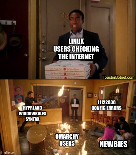 ToasterBotnet - Productivity and Memes@piefed.social to linuxmemes@lemmy.worldEnglish · 23 days agoHyprland Updatemedia.piefed.socialimagemessage-square75linkfedilinkarrow-up1332arrow-down112