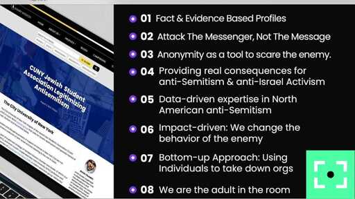 “Fight those who hate the Jewish people” is the listed purpose, and the group’s niche is “dismantle the anti-Israel network by attacking the messenger, not the message.”