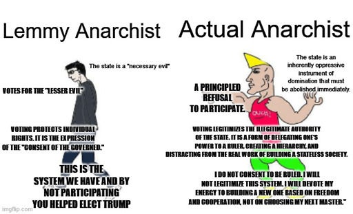 Putting ideology (“voting legitimizes the illegitimate authority”) over pragmatism is goofy IMO. Like, whether you view the state as legitimate or not, in the here-and-now it exists and has power, giving up your influence because you don’t like it is counterproductive.