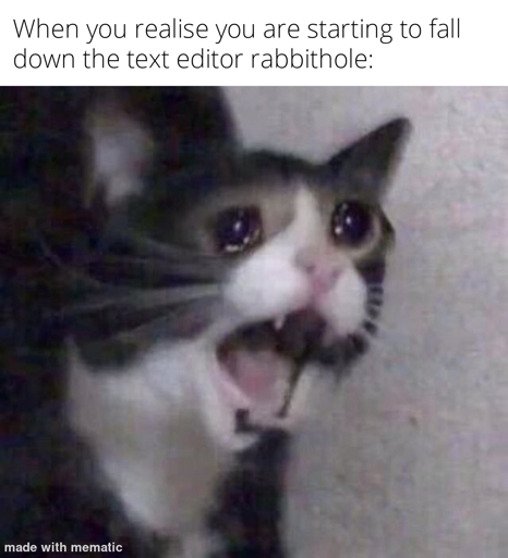 May I introduce you to the simple life of just using whatever text editor and terminal that comes presintalled on your favoraite distro? It’s ridiculous how far this can get you, I’ve been enjoying gnome text ediotor with gnome terminal.