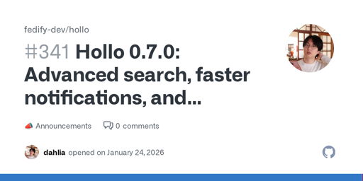 洪 民憙 (Hong Minhee)@lemmy.ml to Fediverse@lemmy.mlEnglish · 1 month agoHollo 0.7.0: Advanced search, faster notifications, and improved client compatibilitygithub.comexternal-linkmessage-square0linkfedilinkarrow-up17arrow-down11cross-posted to: fediverse@lemmy.world