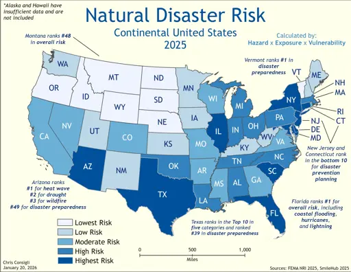 LOL at AZ being highest risk due to heat wave, drought, and wildfires. That’s just every damned day of the week in the southern half of the state, not an uncommon occurrence at all, and hardly a natural disaster. It’s most definitely not anywhere near the same as a hurricane or tornado. And all of them are based on the same source, lack of water because it’s a DESERT.
