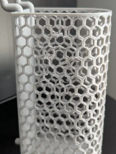 The solid part of the print (back wall) came out just fine, but the hex grid part came… dirty. On the picture, there are a few hex segments that just broke off during the print at the base of vertical segments. And the rest of them have small loops of filament that stick outside of the intended surface, to the sides.