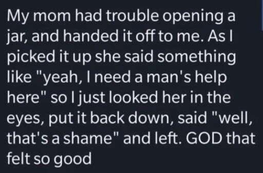 I’m assuming they are a trans girl, so the mom saying she needs “a man’s help” was misgendering her. OP basically affirmed that because they are not a man they cannot help and gave back the jar unopened. Given the pettyness one can assume that the mom misgendering OP is a frequent occurrence.