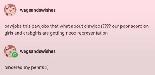transcription: pawjobs this pawjobs that what about clawjobs??? our poor scorpion girls and crabgirls are getting nooo representation… picered my penits :(