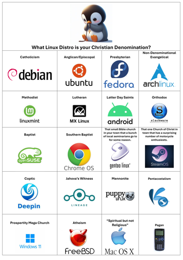 1dalm@lemmings.world to linuxmemes@lemmy.worldEnglish · 15 days agoWhat Linux Distro is your Christian Denomination?lemmings.worldimagemessage-square118linkfedilinkarrow-up1200arrow-down1107