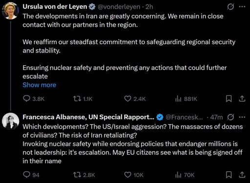 Also the President of Spain says (firefox translated) “We reject the unilateral military action of the U.S. and Israel, which is an escalation and contributes to a more uncertain and hostile international order.” but then goes on to also reject Iran’s (unspecified) actions.