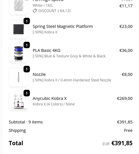 I’m pretty excited, I ordered the Kobra X, along with 9kg of various colour filaments.