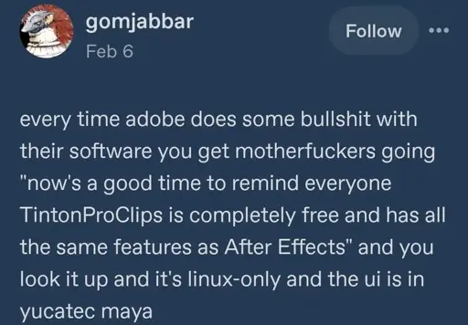 What I’m trying to poke at here is people finding the “perfect savior” to their existing tools that were made out of choice (that enshittified) or complacency (unwilling to move until they find something that is effectively a reverse engineered clone). Of course, that usually doesn’t exist, so they whine about how “FOSS doesn’t match everything I want!” despite being capable of learning and not truly bound to their tools by say an employer.