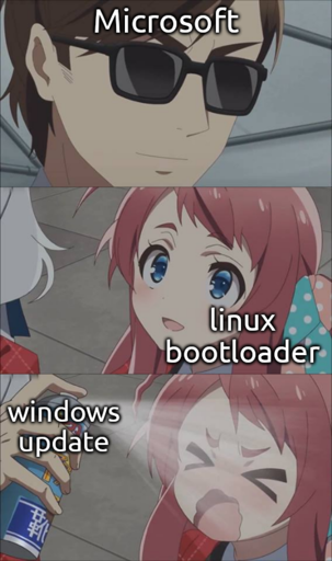 It’s a funny meme and all, but I don’t think Windows Update has killed bootloaders since like Windows 7. Especially with UEFI having multiple boot options has been the default, with Windows having a couple and not caring if there are a couple of more in there for other stuff.