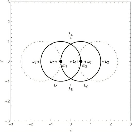For the restricted ring, McInnes found that there are seven equilibrium points in the orbital plane of the dual masses, on which, if the ring’s center were placed, it would stay and not experience stresses, akin to the three stable Lagrange points where a small mass can reside permanently for the two-body problem… McInnes restricted this research to a planar ring (in the plane of the circularly orbiting masses) but says it can be shown that a vertical ring, normal to the plane, can also generate equilibria…